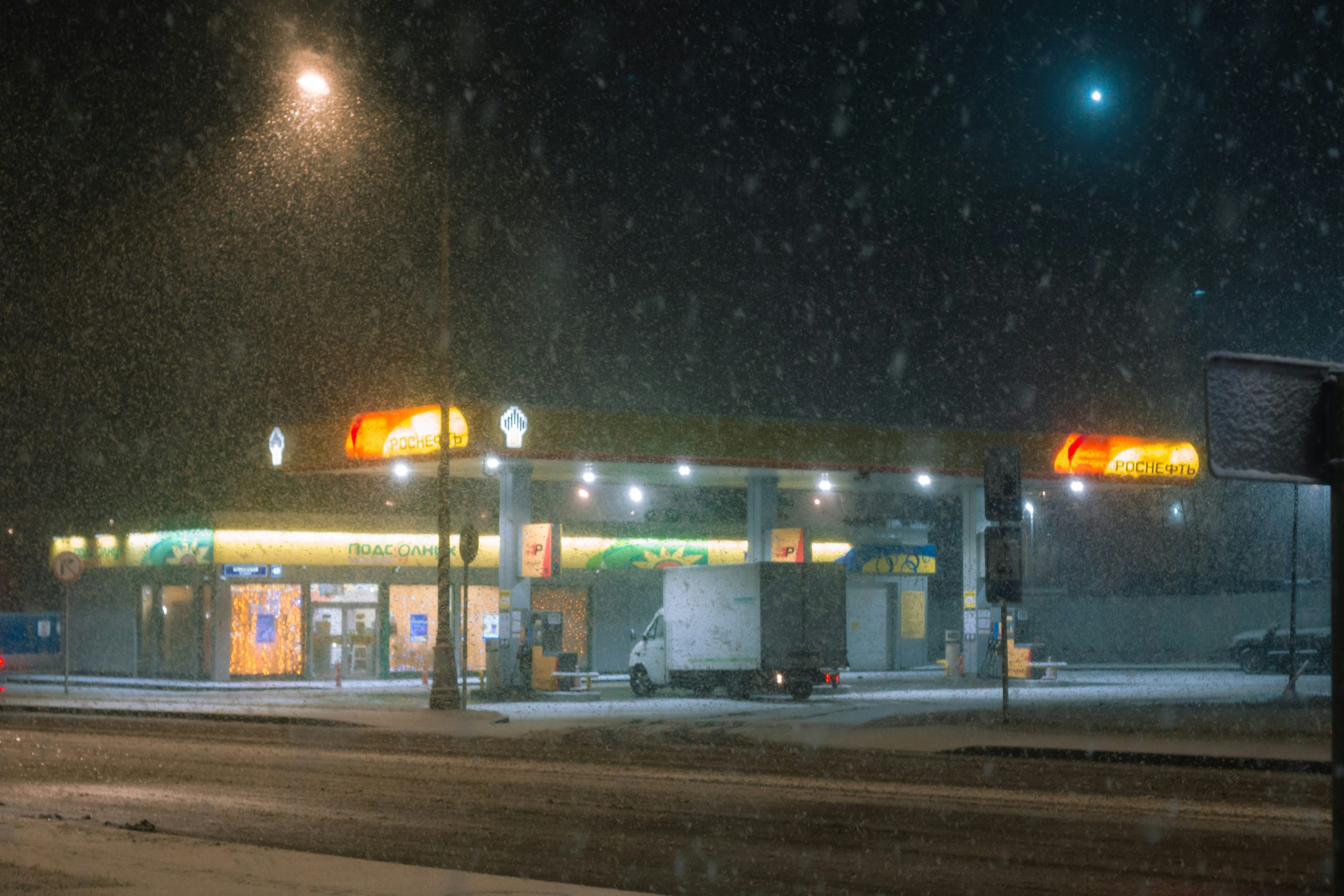 A small gas station glows under harsh white lights at night, its pumps partially buried in drifting snow. Thick flakes fall diagonally across the scene, blurring the dark sky and coating the ground in a fresh layer of white. The surrounding area is quiet and empty, giving the station an isolated, weather-beaten look in the middle of the snowstorm.